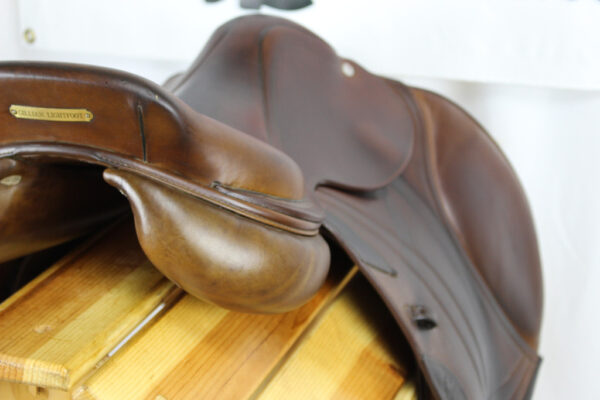 The semi-deep Hunter Jumper saddle gives a good support and a good guideline to the rider’s pelvis, whilst restraining the centre of gravity’s mobility. The rider is offered a refined close contact. For the horse : The wide panels are concave and integrated for a better pressure distribution of the saddle along the horse’s back. These panels have been studied to be positioned and fixed in such a way that the horse’s spine remains entirely untouched. The three point girthing system ensures the saddle’s stability and good position to prevent from nasty pressure points on the horse’s back whilst moving. The saddle opening is increased around the shoulders to free up the horse’s movements when in action. For the rider : The integrated panels offer a refined close contact that enables the rider to have precise actions as he can feel the horse move under him. The close contact has been worked on with a lower cut of the saddle flap around the stirrup bars so that there is only one layer of leather under the skirt. The sweat flap has also been cut higher to contribute to developing the close contact. The stirrup leather surcingles are positioned lower on the saddle flap to reduce the angle between the stirrup, the stirrup bars and the stirrup surcingle, to have less substance under the skirt. The pommel is widened with a thicker strip of foam that overlaps on both sides of the pommel to support the rider’s abductors. Every cut piece of leather of this high quality saddle has been sanded, dyed, and then varnished for a soft touch. The blocks are fixed onto hard vegetable-dyed leather for a sharp cut without tearing. Long buckle-guards are sewn to preserve the underneath of the saddle flap from rubbing with the girth buckles. This high quality saddle is made of calfskin and full grain leather that nicely goes smooth with time.