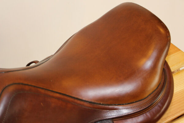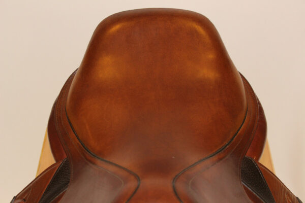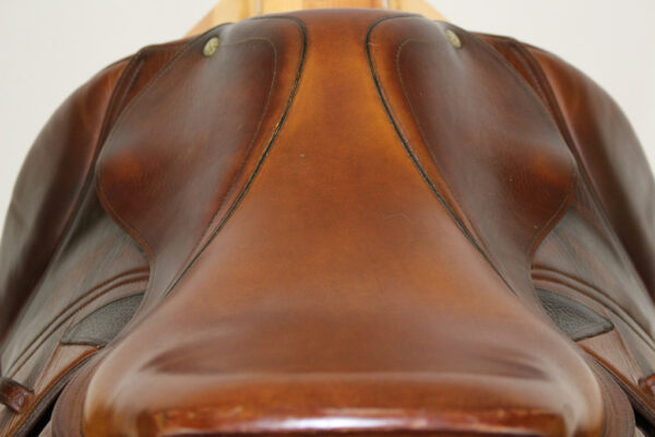 The pony saddle, designed for jumping offers a very close contact and enables the rider to move his centre of gravity around and have free movements. The saddle tree is exclusively designed for young riders, and the panels are adapted to ponies’ morphology. For the pony : The wide panels are concave and integrated to allow a better pressure distribution of the saddle along the horse’s back. These panels have been studied to be positioned and fixed in such a way that the horse’s spine remains entirely untouched. The three point girthing system ensures the saddle’s stability and good position to prevent from nasty pressure points on the horse’s back whilst moving. The saddle opening is increased around the shoulders to free up the horse’s movements when in action. For the rider : The integrated panels offer a refined close contact that enables the rider to have precise actions as he can feel the horse move under him. The close contact has been worked on with a lower cut of the saddle flap around the stirrup bars so that there is only one layer of leather under the skirt. The sweat flap has also been cut higher to contribute to developing the close contact. The stirrup leather surcingles are positioned lower on the saddle flap to reduce the angle between the stirrup, the stirrup bar and the stirrup surcingle, to reduce thickness under the skirt. The pommel is widened with a thicker strip of foam that overlaps on both sides of the pommel to support the rider’s abductors. Every cut piece of leather of this high quality saddle has been sanded, dyed, and then varnished for a soft touch. The blocks are fixed onto hard vegetable-dyed leather for a sharp cut without tearing. Long buckle are sewn to preserve the underneath of the saddle flap from rubbing with the girth buckles. The central part of the saddle is mainly made of calfskin to feel closer to the horse and the edges are made of full grain to strengthen the frame.