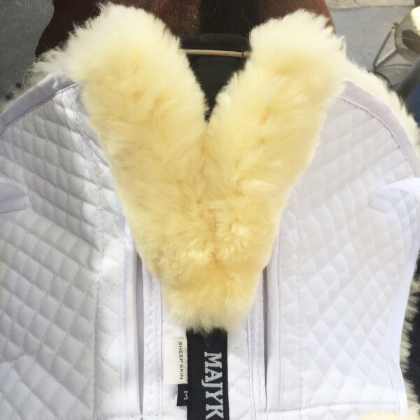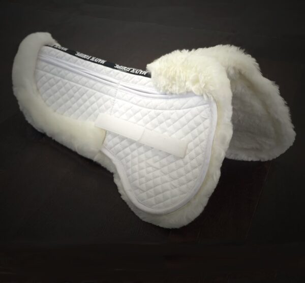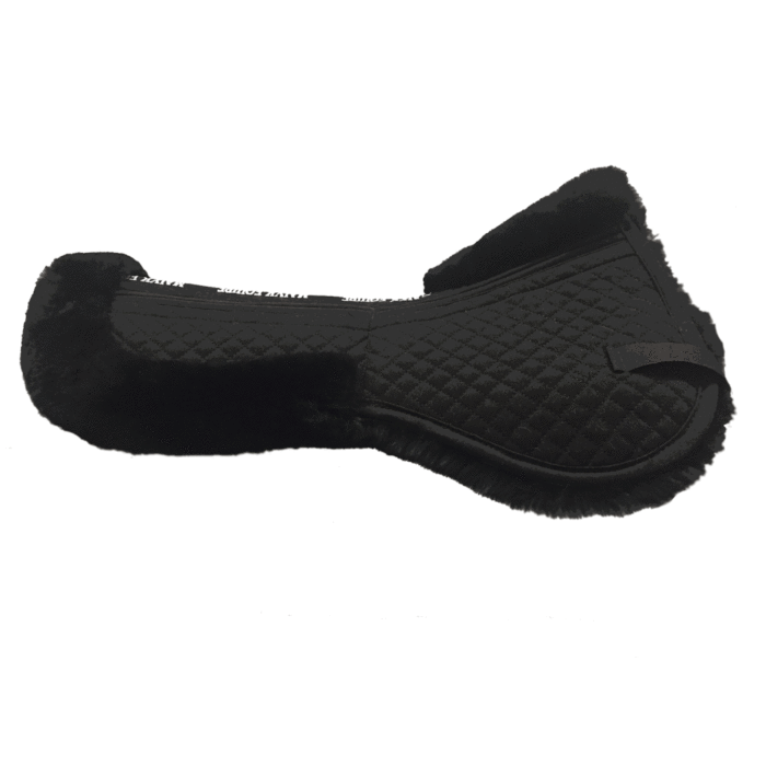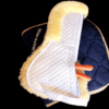 Majyk Equipe ‘Ergonomics’ Correction Fleece Half Pad with Impact Protection Shims provides the ultimate combination of comfort and technology. Constructed from a high-loft, dense 1 1/4″ long 100% Australian fleece with lightweight fabric (most pads have a less dense fleece), the Majyk Equipe half pad is fully quilted and combines natural cushioning and moisture wicking qualities of sheepskin with ultimate impact protection. The pad features unique Split Wither Relief technology to relieve pressure across the withers and Spine Relief along the underside of the pad. The pad has two front and rear pockets along the spine, Pockets can be used to make a total of 24 unique saddle fit adjustments. Shims are inserted from the top, not bottom, ensuring the shims sit securely in pocket. The shims are made of a lightweight and customizable impact protection material, which limits force of impact through the saddle in both directions: Direction 1) force of impact into the horses’ back from the rider’s weight and movements, Direction 2) force of impact traveling up from the horse’s back through into the riders lower back and spine. This makes for a comfortable ride for both horse and rider. Shims can be trimmed and alternated in different thicknesses as needed with the horse’s development.